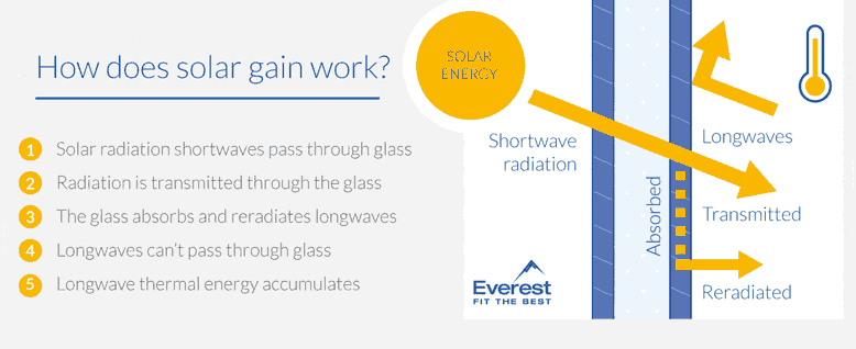 Sunlight produces shortwave infrared radiation – this is what warms objects in the sunshine. The shortwaves are absorbed by glass from the outside and the energy becomes re-radiated from the inside of the glass as longwave infrared.