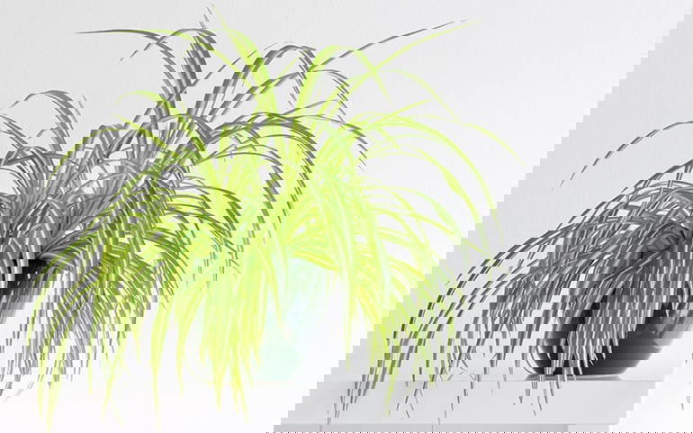 The Spider plant, sometimes known as a ribbon plant is a widely-popular houseplant that has long thin tendril leaves in green and white. Due to its long draping leaves, the plant is often placed on the edge of high cupboards or in hanging plant holders to allow it to hang elegantly.
