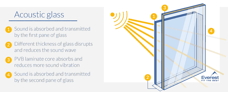 Noise reducing glass has a laminate coating on one of the panes of glass that helps to absorb more sound waves as they transmit through the glass.